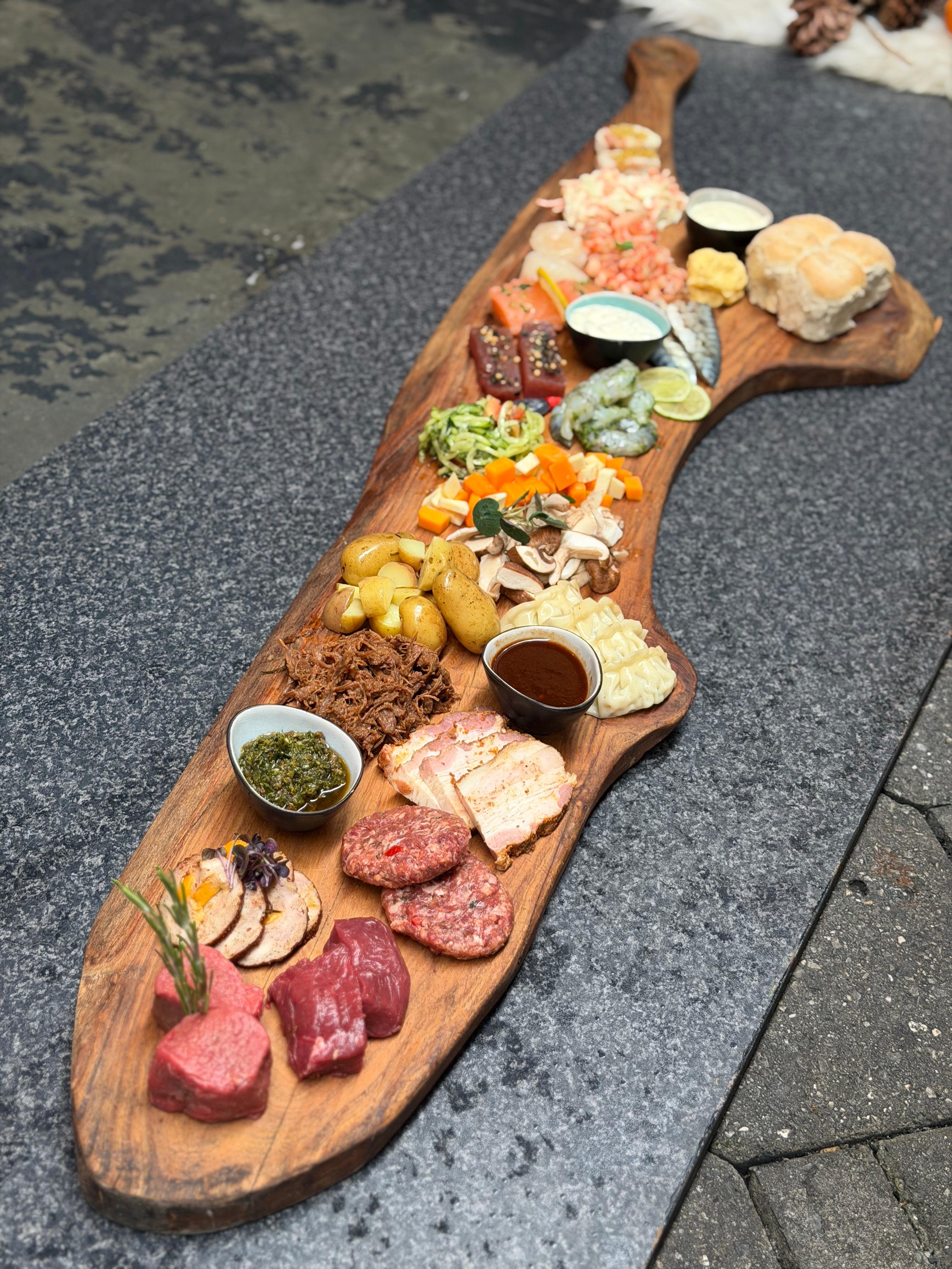 Paddenstoel – Geitenkaas met bacon, gember en jalapeño – Roasted pompoen en pastinaak – Gekonfijte krieltjes – Gepofte courgette en tomaat – Crispy Coleslaw – Mergboter – Aioli – Breekbrood van Van Mook – Bourbon BBQ Sauce – Chimmichurri – Jalapeño mayo